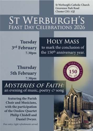 We welcome you to the Website of St Werburgh's Parish, as we wish to welcome you to the Church and Parish itself. Situated between Chester's main shopping area and the picturesque Grosvenor Park, our church represents the heart of the Catholic faith in the City. The Parish covers much of the area south and east of the city centre, and we welcome many visitors to our city, Catholic and non-Catholic alike.