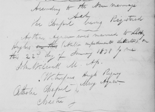 A week later, St Werburgh’s Marriage Registers, 1827–1856, Page 17, recorded the marriage of Arthur Agnew and Letty Hughes on 22 January 1838.