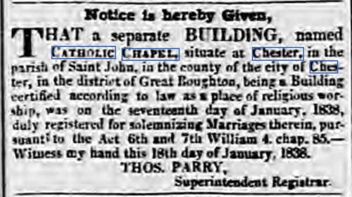 The following notification appeared in the Chester Chronicle of 19 January 1838, Page 2 Col 3.