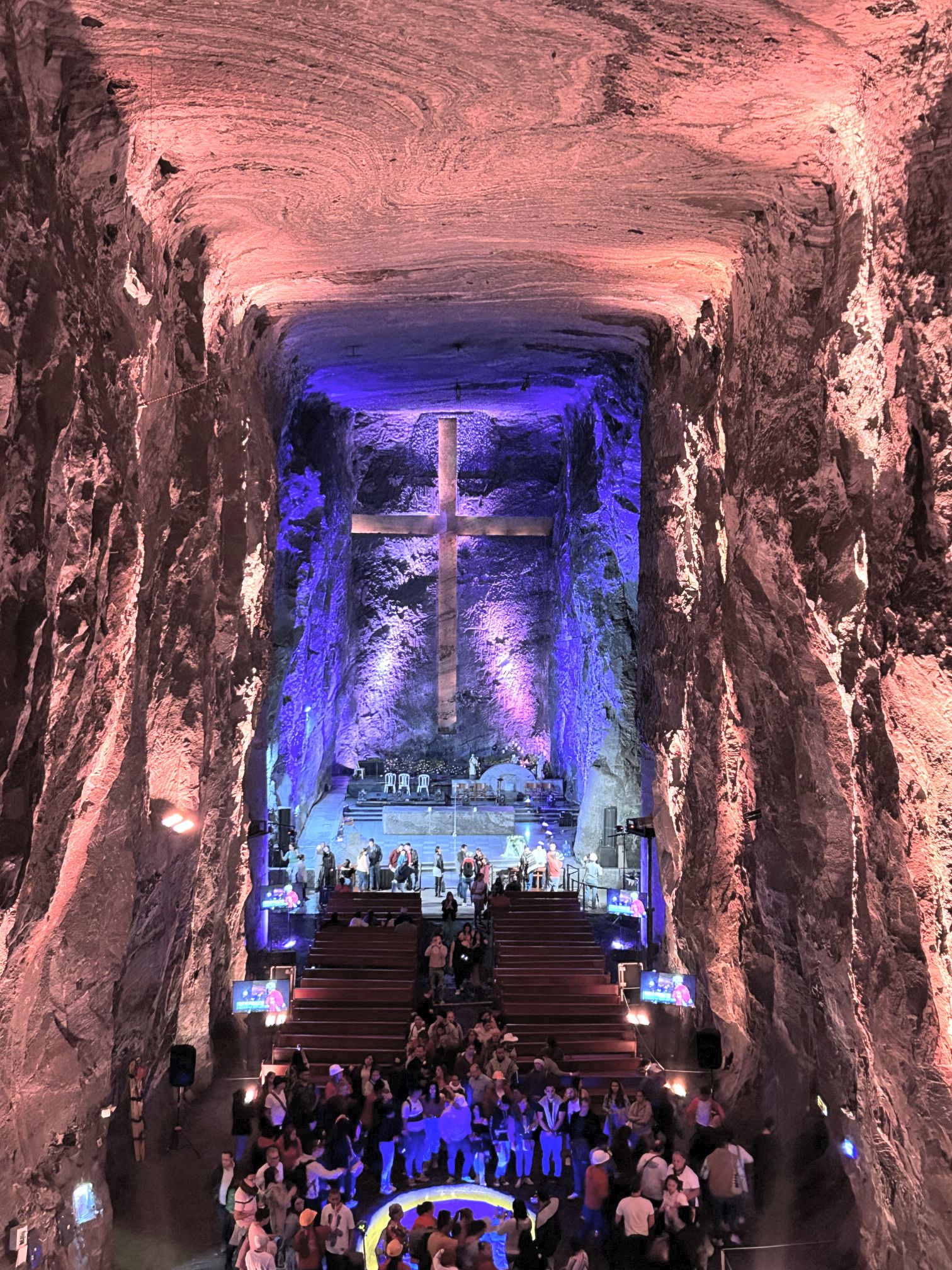 The Salt Cathedral in Colombia is a fully consecrated cathedral carved out of the rock and salt 200 metres below a mountain in Zipaquira, about 30 miles north of Bogota. The mountain has been mined for salt for centuries. It is accessed via a descending ramped walkway alongside which are the Stations of the Cross, either carved out of the rock walls or carved in relief.